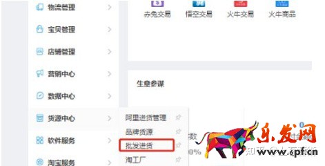 2、在貨源中心的下拉菜單當中,我們找到批發進貨的選項,進入到淘貨源商城頁面當中,具體位置如下圖。