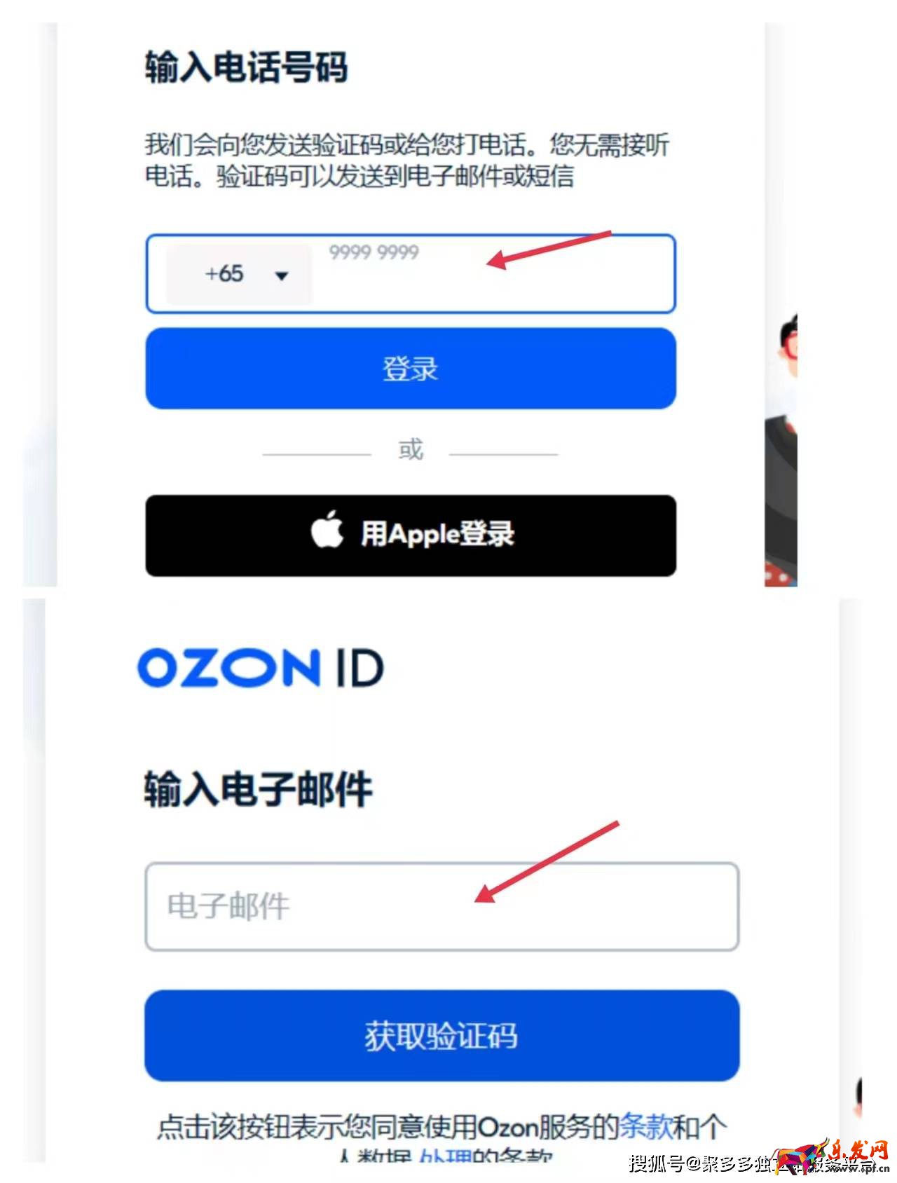 (1)進入ozon網頁后可在左下角切換語言為中文,點擊注冊進入注冊頁面,輸入手機號,手機號用國內的即可,點擊登入,就會跳轉到輸入電子郵件頁面,輸入電子郵件,獲取驗證碼,填寫郵箱收到的驗證碼后,再填一個手機獲取的驗證碼。