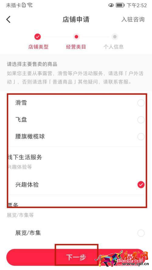 7 打開(kāi)店鋪申請(qǐng)的界面選定經(jīng)營(yíng)類型后點(diǎn)擊下一步按鈕