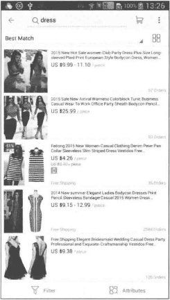 在無線端搜索“dress",搜索的結果是按照默認的Best Match算法進行排序,我們可以看到有手機專享價的圖片,從某種意義上而言,在這個搜索結果頁上設置了手機專享價的商品已經獲得了較高的自然搜索曝光率。