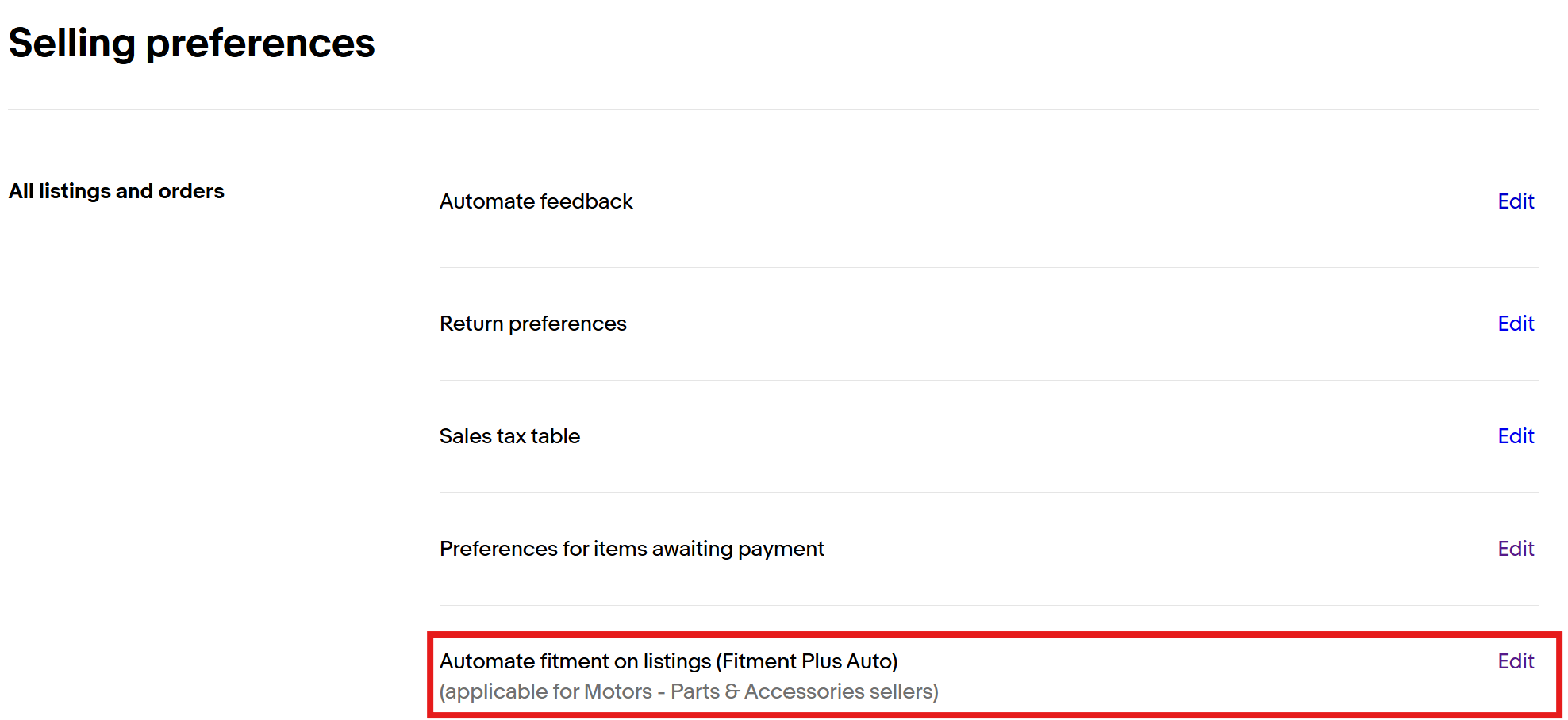 如果賣家不想將額外適配數(shù)據(jù)自動添加到您的物品刊登中,只需進入“帳戶設(shè)置” (Account settings),選擇“銷售偏好” (Selling Preferences),點擊“Fitment Plus Auto”旁邊的“編輯”,將該功能關(guān)掉。如下圖所示:
